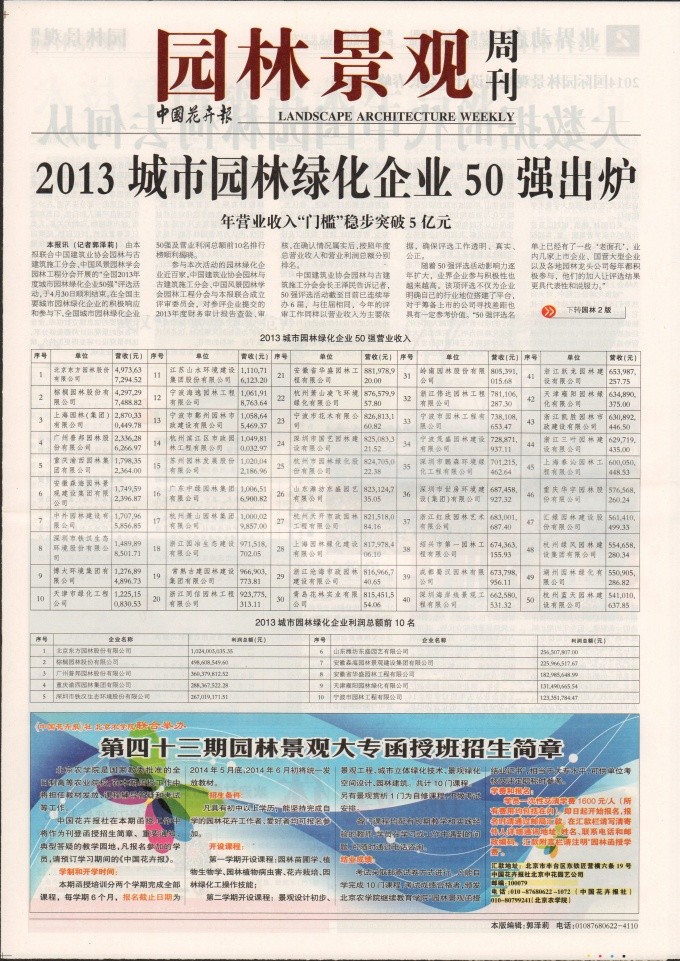 近日,由中国花卉报联合中国建筑业协会园林与古建筑施工分会、中国风景园林学会园林工程分会开展的“全国2013年度城市园林绿化企业50强”评选活动落下帷幕。全国城市园林绿化企业50强、营业利润总额前10名,以及净营业利润率、净资产利润率、总资产利润率前10名排行榜一同揭晓。