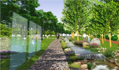 设计改造长度南北约长700米,东西约长44—80米 ,面积约为4.5万平米。设计分为街头公园区、广场活动区和生态公园区三个功能分区。景观设计充分体现水滴、水流和水岸的概念;生态公园区充分体现生态理念。植物的设计注重季相变化,成片成丛成林种植,让人印象深刻;同时引人了香花植物。灯光的设计,除了满足基本的功能性照明外,特别突出效果和特效设计,营造极具现代感却不失浪漫的夜景效果。